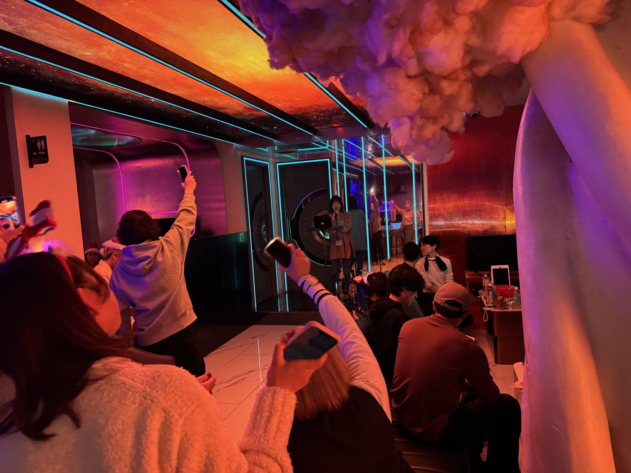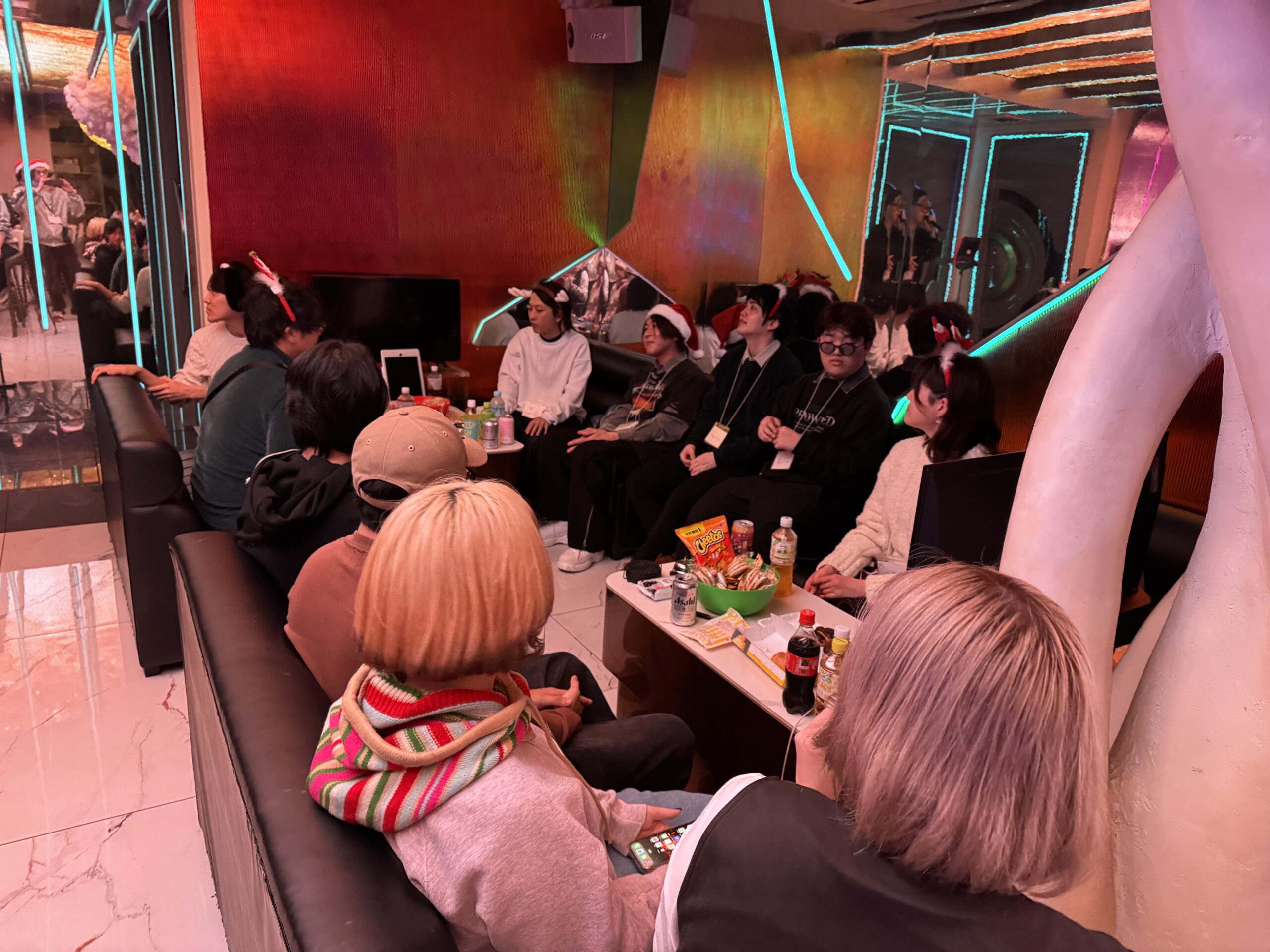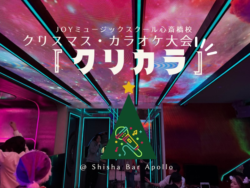 「クリカラ」とは、クリスマス・カラオケ大会の略。今回大阪エリアとしては初のクリスマス企画ということで、皆さんで盛り上がれるよう、このような派手でテンションの上がるナイトバー「Shisha Bar Apollo」での開催となりました。